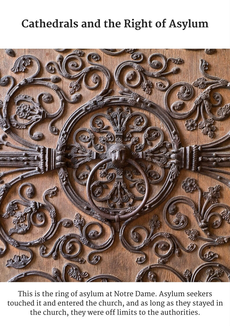 [29:16] Once within the asylum zone, the criminal couldn’t be touched. But as soon as they left, they could be captured to go back into the hands of justice. When you go to Notre Dame, look for the Ring of Asylum on the door where you exit the Cathedral. I’ll put a picture of it on the show notes for this episode. Once you had the Ring of Asylum in hand, you were safe from the law.